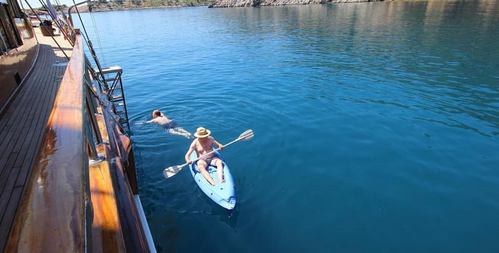 Onboard dining is a highlight, with delicious meals prepared fresh every day. The yacht’s fully equipped galley includes an espresso machine, fresh juice maker, and ice maker, so you can enjoy your favorite drinks at sea. Whether you prefer dining indoors or on the deck, you’ll always have a stunning view. For fun and adventure, Seğmen has canoes, snorkeling gear, and fishing equipment, plus a 3.5-meter tender for exploring hidden bays. If you just want to relax, there’s a JBL Bluetooth speaker, board games, and a small library to enjoy at your own pace.